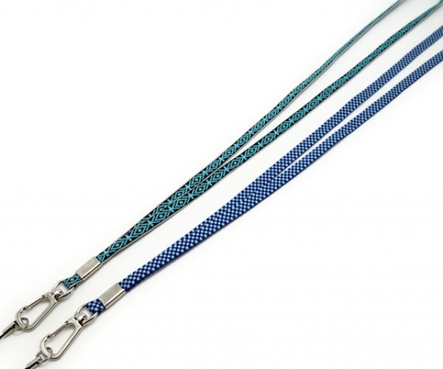ポリエステル素材のやわらかいテープを使ったネックストラップ 素材の色目は数種類ございます。 長さや・先端のパーツの種類・ロットなどご相談承ります。