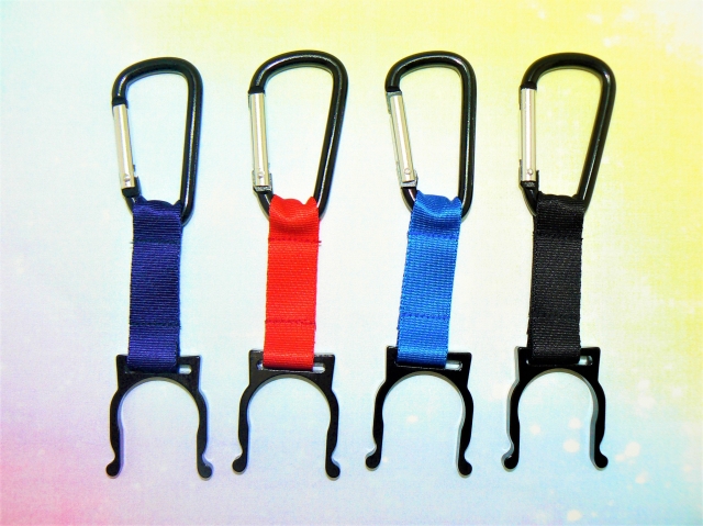 カラビナによりバッグやベルトループなど簡単に取り付け取り外しが可能です。 ペットボトルの首元にワンタッチで装着できます。 ペットボトルの取付パーツも種類があります
